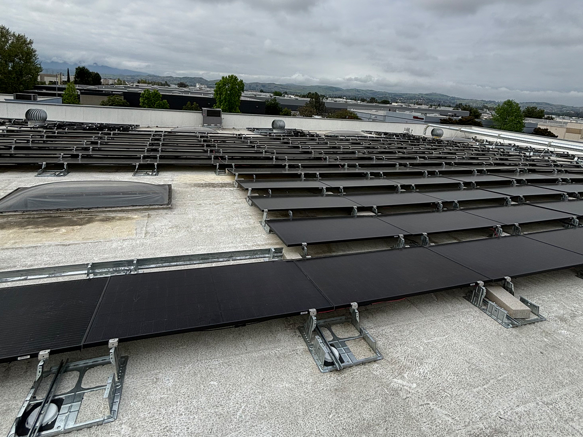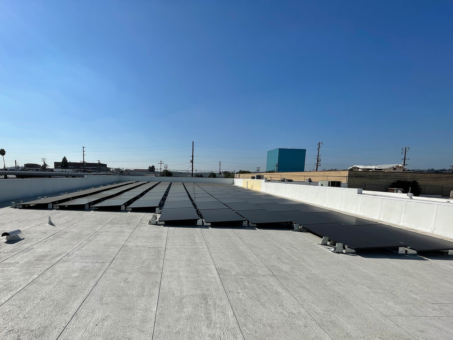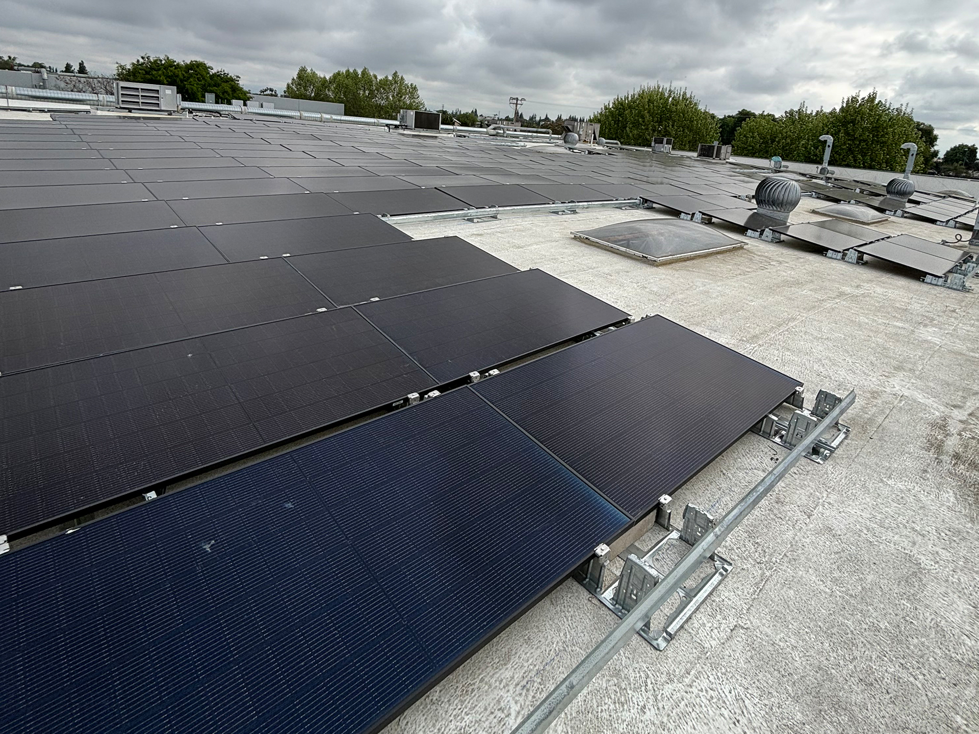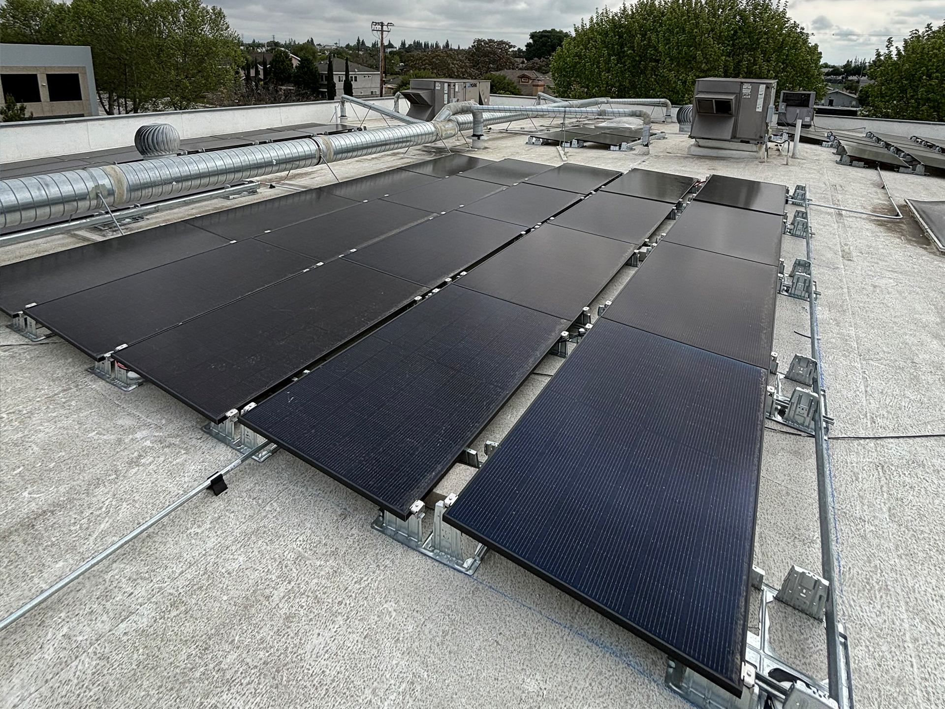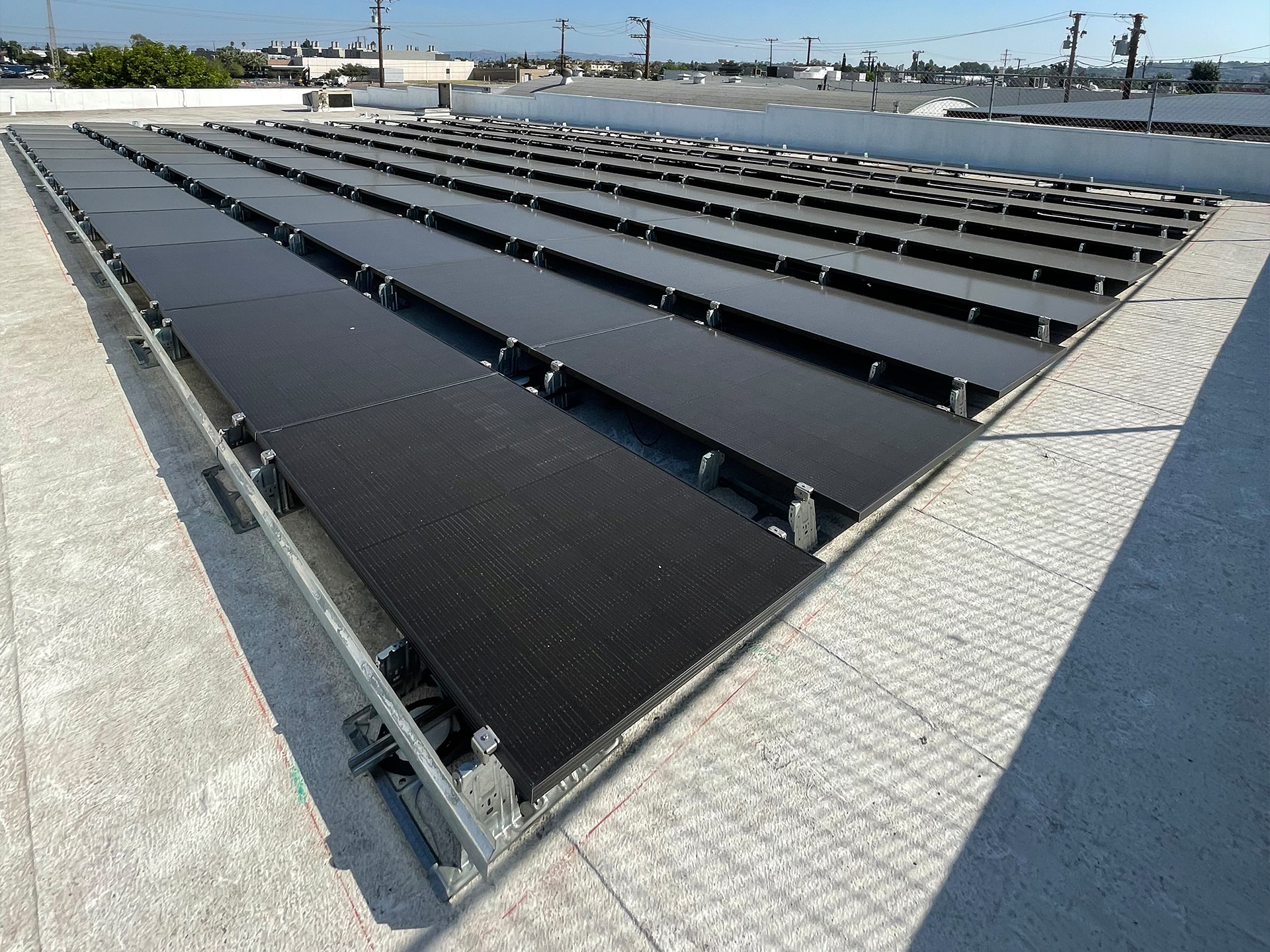 CS&E installed a 41.2 kW commercial solar energy system on a flat membrane roof using a ballast-mounted racking solution designed to avoid roof penetrations while maximizing structural safety. The system features 103 Q-Peak DUO 400-watt solar panels integrated through a DC system configuration to deliver reliable, high-efficiency energy production for daily business operations. This solution was designed to help the facility stabilize rising utility costs while maintaining full roof integrity, providing a clean and durable commercial solar installation that supports long-term energy savings and operational efficiency.